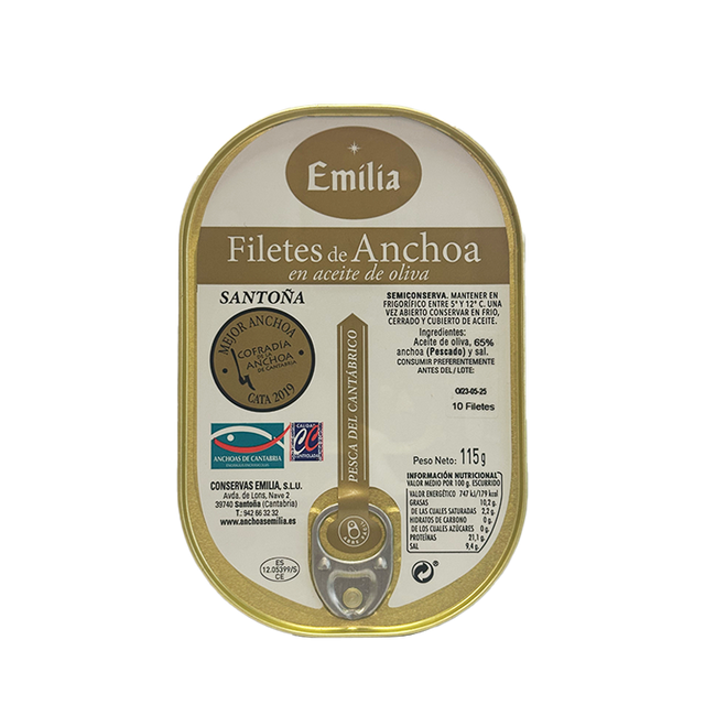 Le acciughe del Cantabrico “Serie Oro” di Conservas Emilia rappresentano l’espressione più alta della tradizione conserviera di Santoña. Pescate nel Mar Cantabrico durante la stagione primaverile, quando il pesce raggiunge la massima qualità, vengono selezionate e lavorate interamente a mano secondo metodi artigianali.